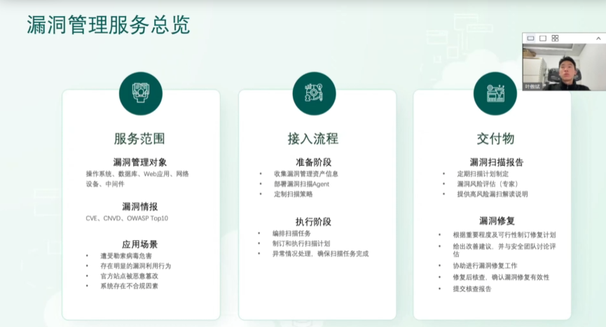 漏洞管理服务的总体概览如上图,会确定漏洞漏扫或者说渗透的服务范围,再接入流程和执行,最后会提供漏扫和修复的报告。