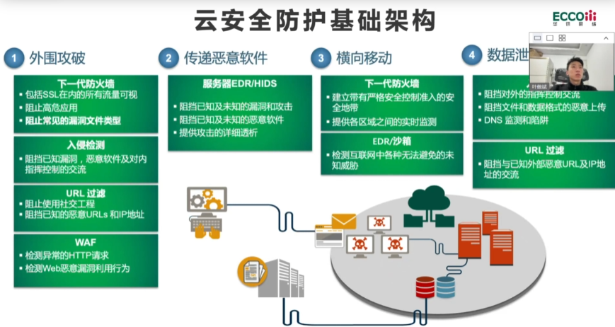 上图是云安全防护的基础架构,基于云安全防护的基础架构。在不同阶段需要不同的防护手段。从外围突破阶段来看,需要下一代防火墙、入侵检测、URL过滤、WAF,从这些设备中可以从外围突破阶段找到对手的攻击手段。