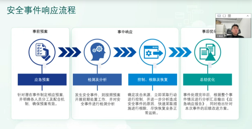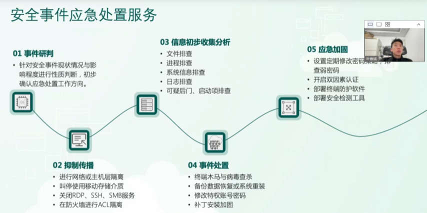在事后可以为客户提供安全事件响应服务,包括针对不同类型的安全事故会有相应的事前预案,如果真正发生了这些预案中的事故,会及时帮助客户去做事件的分析,首要是帮助客户调查梳理清楚受影响的资产,进行扩散的控制,以及业务的恢复。在完成了恢复和遏制之后,会去对攻击的手段做一个攻杀链的分析和溯源,告诉客户攻击是来源于什么地方,是怎么攻进来的,最后做一个总结优化。