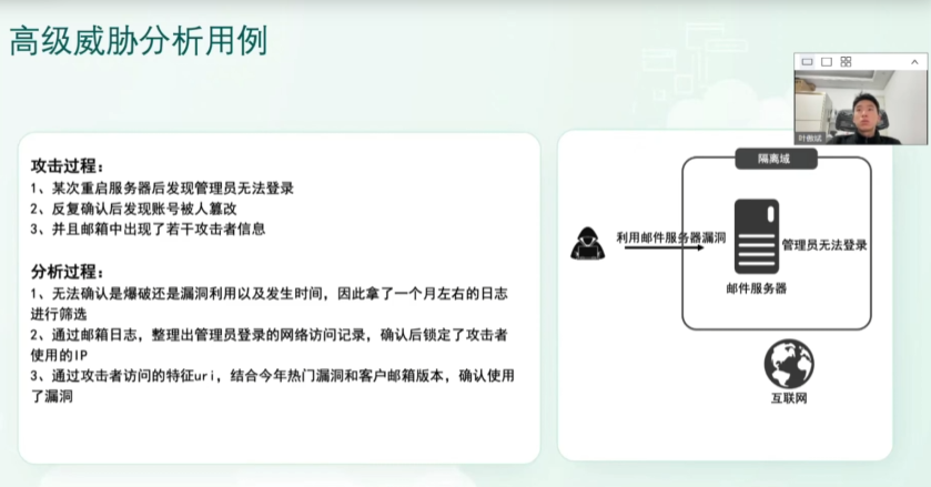 这是一个高级威胁分析的用例,从这次攻击过程中发现,黑客是利用了邮件服务器的漏洞达成了到达隔离域内的一个邮电服务器,造成了管理员无法登录,通过反复确认,发现该账号是被人篡改了,并且邮件里面出现了若干的攻击者信息。通过邮箱日志整理出了管理员登录的网络访问记录,最后锁定了攻击者的IP,根据攻击者访问的URI特征,确认了是通过某一个今年热门的漏洞达到入侵,该漏洞影响的版本和客户邮箱版本是一致,确认使用了该漏洞最后完成攻击,最后华讯整理提交了调查分析报告。