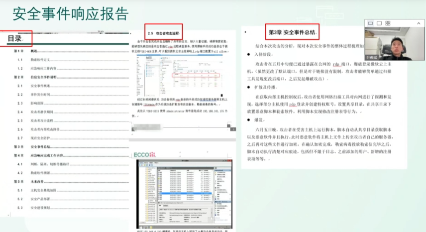 上图是安全事件的响应报告,包括整体的攻击流程,安全事件的总结和未来改善加固和建设规划建议等。
