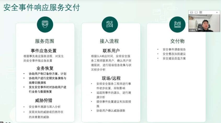 上图是一个安全事件响应服务交付的流程,首先会确认服务范围,之后会去联系客户明确介入流程,最后提供交付物。