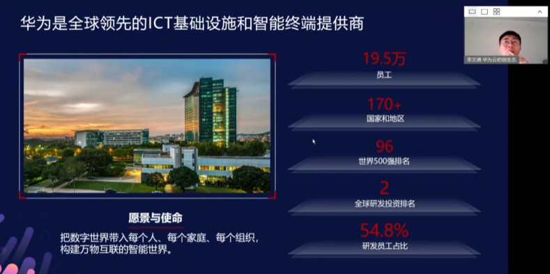 首先介绍下华为公司,华为是全球领先的ICT基础设施建设和智能终端的提供商,目前有将近20万的员工,在全球170多个国家和地区都有分支机构。同时华为也非常重视研发投入,研发员工的占比超过了54。8%,华为希望把数字世界带入每一个人、每一个家庭、每个组织,构建万物互联的智能世界。华为一直把创新以及研发刻在自己公司的基因里面,所以面向所有的开发者以及创新型企业提供了非常多初创生态权益。