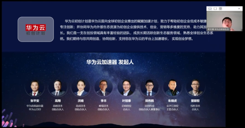 第二个板块就是华为云加速器,华为云加速器是今年9月份华为云CEO张平安协同了另外的7家国内顶尖的初创领域VC投资的合伙人共同发起的。