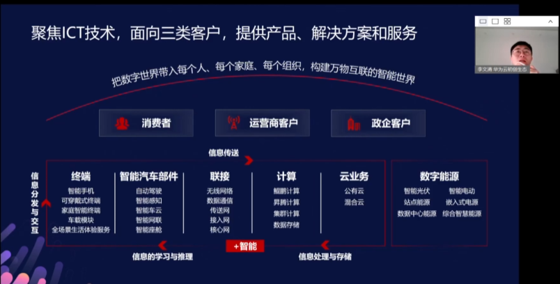 华为的客户群体主要是分为三类。第一类是消费者,包括智能终端手机、汽车等都在消费者业务模块;第二个模块是运营商模块,这里面就涉及到无线的通信、核心网、接入网等与连接有关的业务场景;第三个就是面向政企客户,包括服务器、计算等。华为云就是来自政企模块。