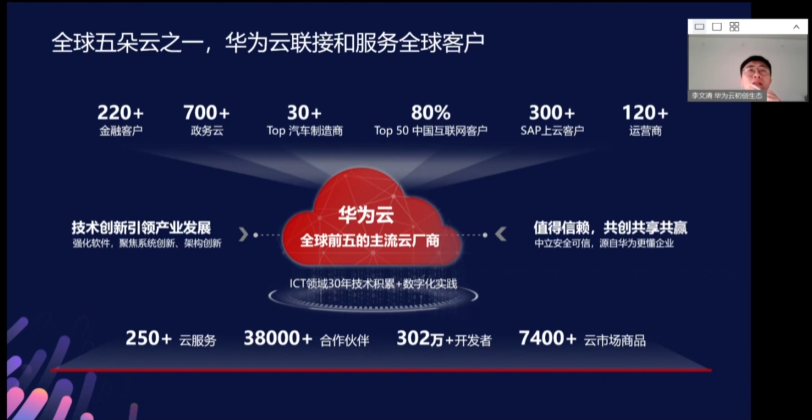 华为云是2017年开始正式运行,在五年的时间里面一直保持非常高的增速,目前已经成为全球五朵云之一。在云服务上有超过了250家云服务的产品和类型,有超将近4万家合作伙伴,超过300万开发者,在云市场上也已经上架了来自伙伴的将近8,000家的应用和产品。目前在国内的市场份额是仅次于阿里云,位列国内的云厂商的第二。