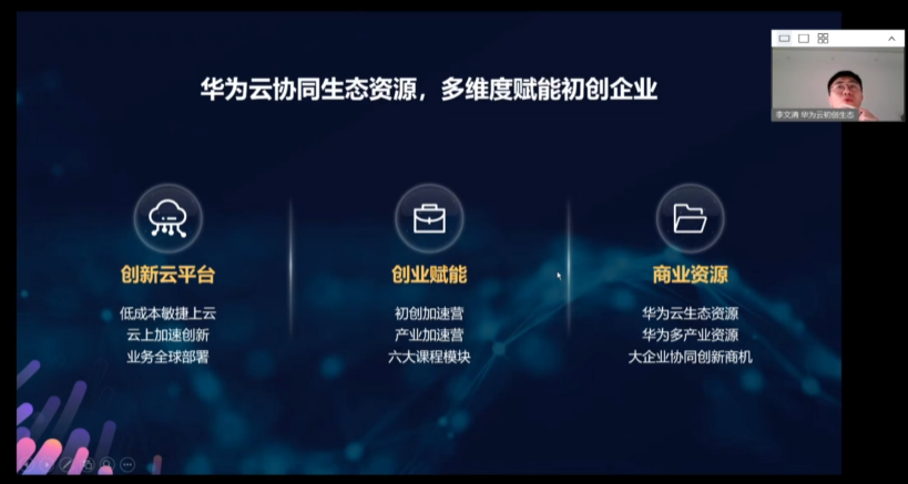 第三个是商业资源,华为云的整个生态伙伴圈层里面都有非常多的丰富的商业资源,也是希望通过华为云的初创计划,把这些商业资源能够传递给创新创业型企业。