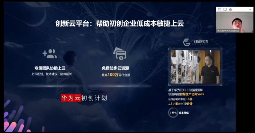 下面具体说一下,首先在创新云平台方面,华为有专属的团队协助初创企业来做好上云的规划,会给企业提供技术的建议。陪伴初创企业在不断迭代的过程中找到华为云上最适合的产品,帮助企业优化做到降本增效。其次会给所有的初创企业提供免费的云资源代金券,最低只要加入就可以获得5000元的云资源服务器,云资源代金券的福利最高每家企业可以申请获得100万元的免费云资源代金券。例如上海有一家企业叫飞榴科技,是服装产业柔性供应链相关企业,去年加入华为云初创计划后,基于华为云的CCE云容器引擎快速的构建了生产协同的SAAS系统,提高了运维部署的效率,降低了整个部署的成本。