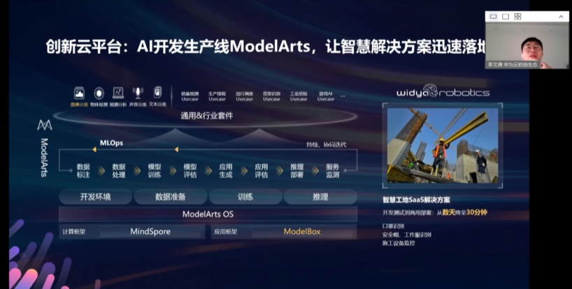 华为云的AI开发生产线ModelArts也可以提供给初创者去使用,这里面有非常多AI相关能力。例如有一家公司是专门做智慧工地的SAAS解决方案。它就基于华为云的ModelArts能力开发出适用于工地场景的功能,包括像口罩识别、安全帽工作服的穿戴识别以及在工地上施工设施的监控统等。