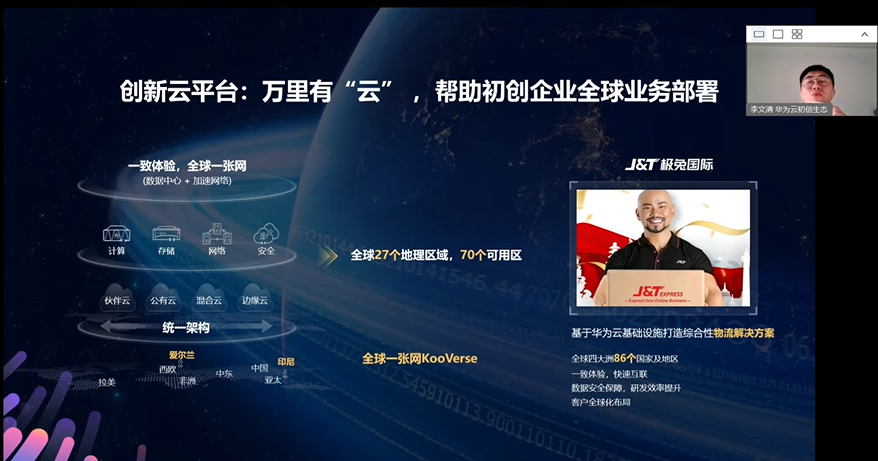 华为云在全球也有非常广泛的全球化布局。大家可以看到上图在拉美、西欧、非洲、中东、亚太都有自己的服务器节点。今年在亚太和爱尔兰开设了新的服务器节点,华为云在全球一共有27个地理区域、70个可用区,这些海外的节点和布局也都可以提供给初创企业,去帮助业务在当前全球化的浪潮下面能够快速的走出国门。例如极兔国际,是一家全球化的物流公司,同时也是一家创业型企业,他基于华为云在全球布局已经在全球四大洲86个国家和地区开展了自己的物流业务,在全球华为云有一致的体验、快速互联,保证每一个客户的全球化的布局。