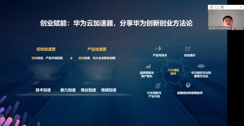 整个华为加速器会分为6大课程模块,包括创业通识、华为的组织文化和管理的方法论、战略规划和前沿趋势的分享、以及行业洞察和产业升级的建议,同时也会请到华为云品牌部、技术部的高级管理人员和技术专家来作为导师,来帮助初创企业在加速营里面能够快速的获取到所需要的方法论和相关培训资源。