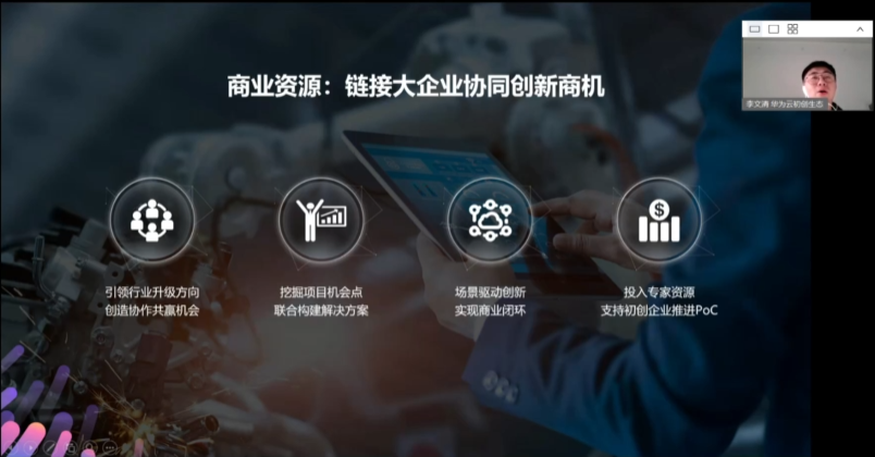 最后华为云有非常大的商业资源,就是大企业协同创新。希望初创企业能够跟华为公司累积的大客户也能够产生商业上的协同,华为是希望大客户能把自己的创新场景的需求开放出来给初创企业,帮助他去找到相应的初创企业跟他联合去做基于真实场景的商业机会点。