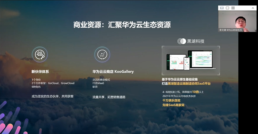 除此以外,华为云可以帮助初创企业找到更多的商业资源。首先华为云有自己的伙伴体系,所有的初创企业进入到华为云的生态之后,未来有可能会是华为的大客户,也有可能会成长为华为特别好的合作伙伴。华为云还有一个云商店KooGallery,上面上架的是所有伙伴的商品,通过华为销售渠道共同去向全球售卖。例如,上海的黑湖科技,是做工厂的云端制造协同平台相关产业,去年把他们的产品放到了华为的云商店,通过华为云的渠道以及销售人员去共同售卖,去年在华为云上获得了千万级的俱乐部奖,也就是说他从华为云台上面获取到的相关的线索和GMV大概已经超过了千万。
