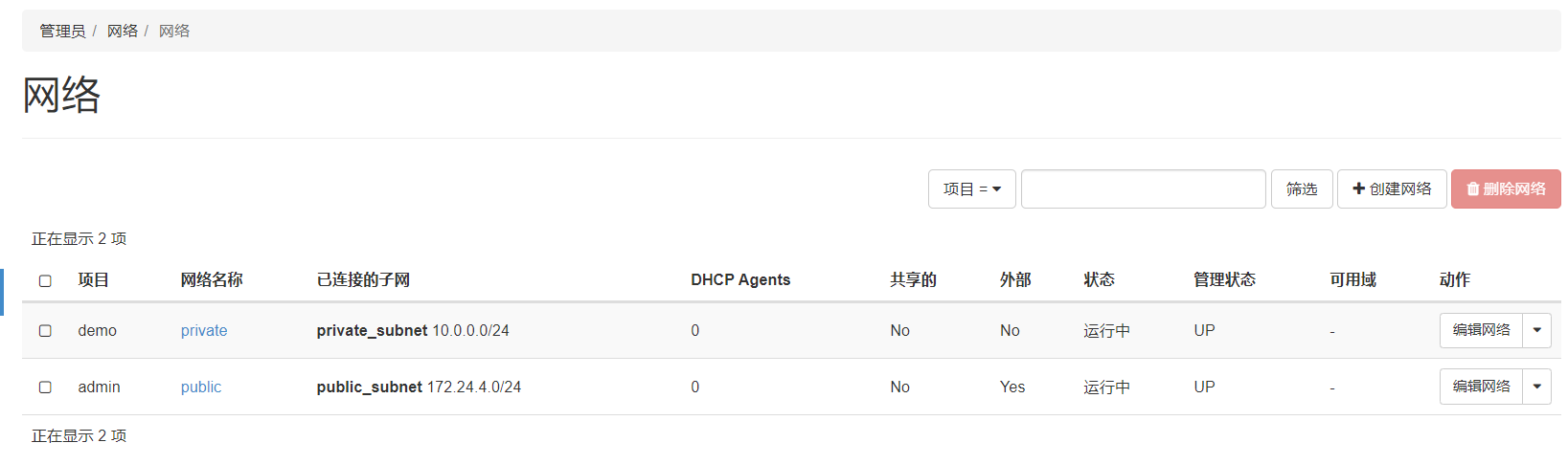 这2个网络,都是packstack安装后自动配置好的。将这2个网络都删除掉(先将端口、路由子网接口、路由网关删除),再用demo新建一个demo项目private网络,实例仍然失败,同样的错误。