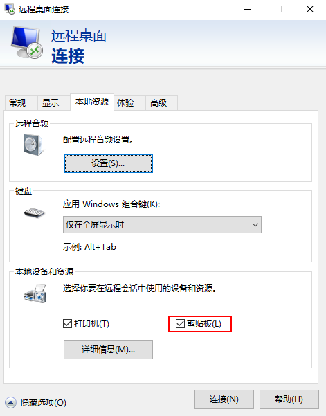 单击“本地资源”选项卡,勾选“剪贴板”。
