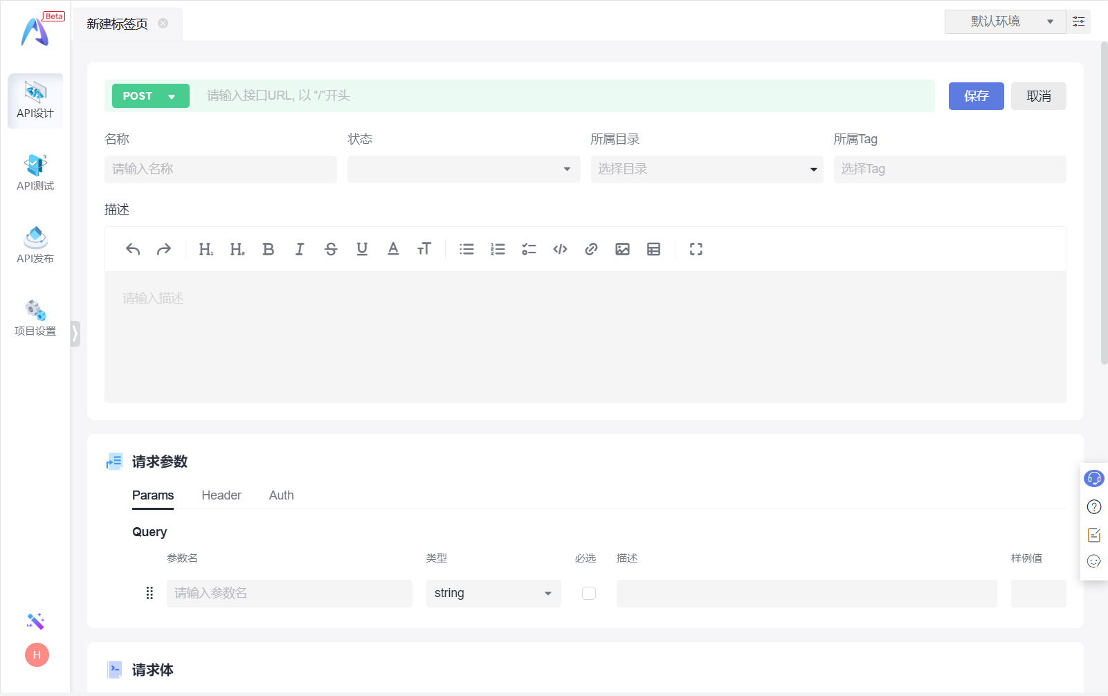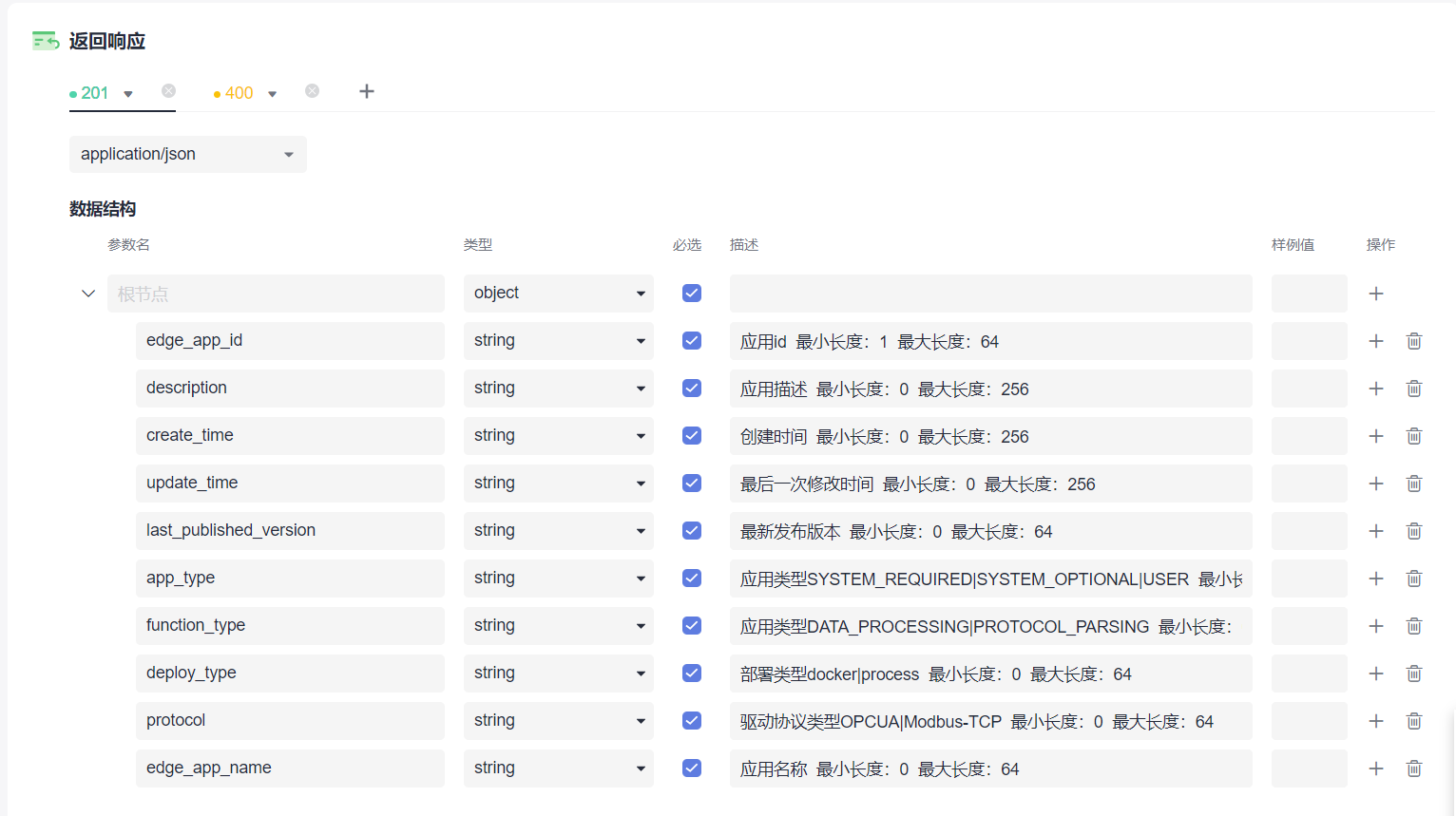 4)介绍:创建边缘应用接口是一个使用POST方法进行请求的接口,新建一个POST接口主要有四个部分:接口基本信息、请求头、请求体和返回响应。