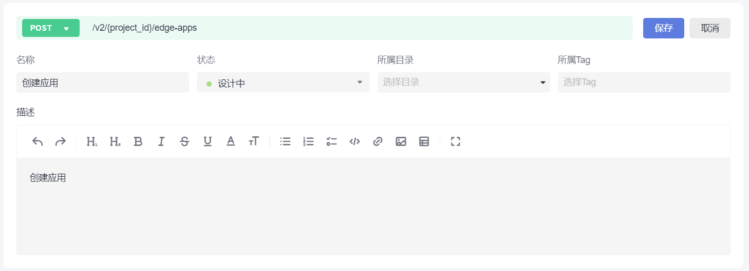 接口的名称为“创建应用”,路径为“/v2/{project_id}/edge-apps”。