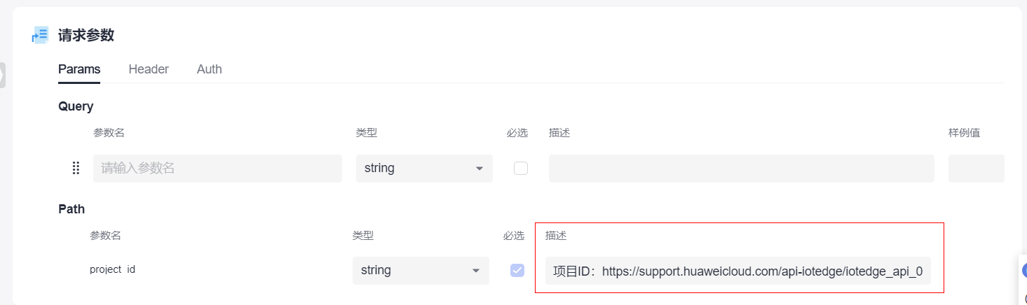 在路径中输入“/v2/{project_id}/edge-apps”后,请求参数会自动识别路径中的请求参数。