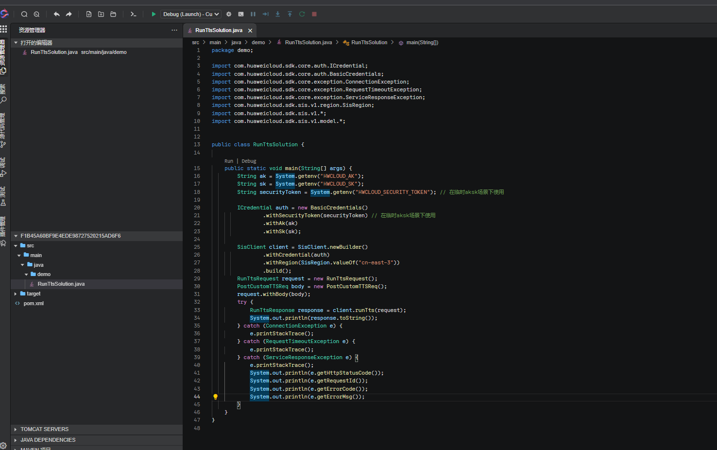 打开CodeArts IDE Online,将刚刚响应体复制到IDE中,启动调试,可以将刚刚生成的诗词合成一段mp3音频,双击音频可以打开播放。