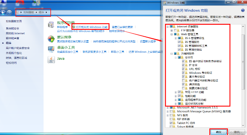 控制面板-------->程序--------->打开或关闭windows功能------------->打开勾选internet信息服务相关选项