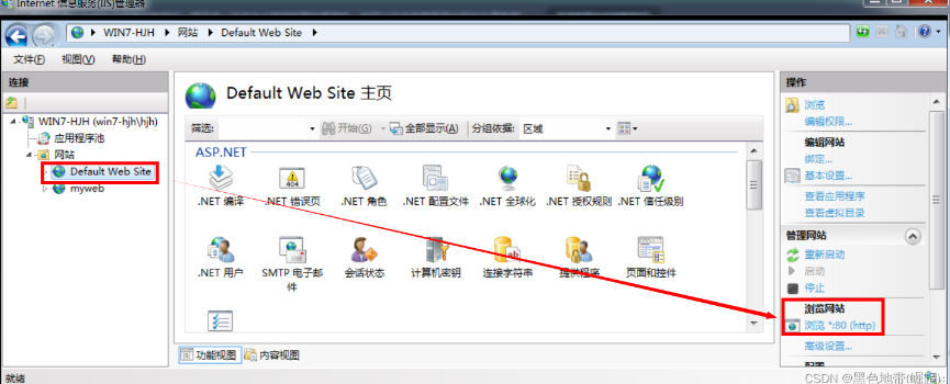 点击网站----->Default Web Site------>点击点击右边的 浏览 打开网站,如果出现IIS则说明可以正常使用
