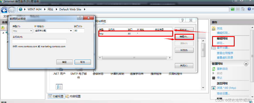 ③回到IIS,点击右侧的绑定-------->选择要绑定的网站,点击编辑