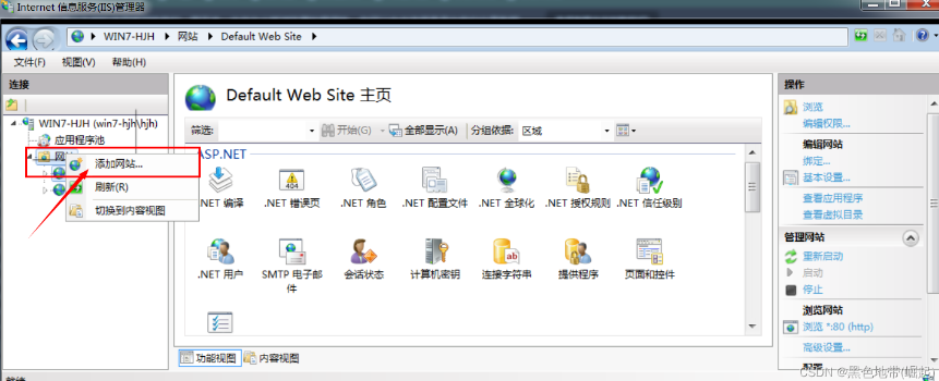 在IIS管理器里面,默认里面有个网站Default Web Site