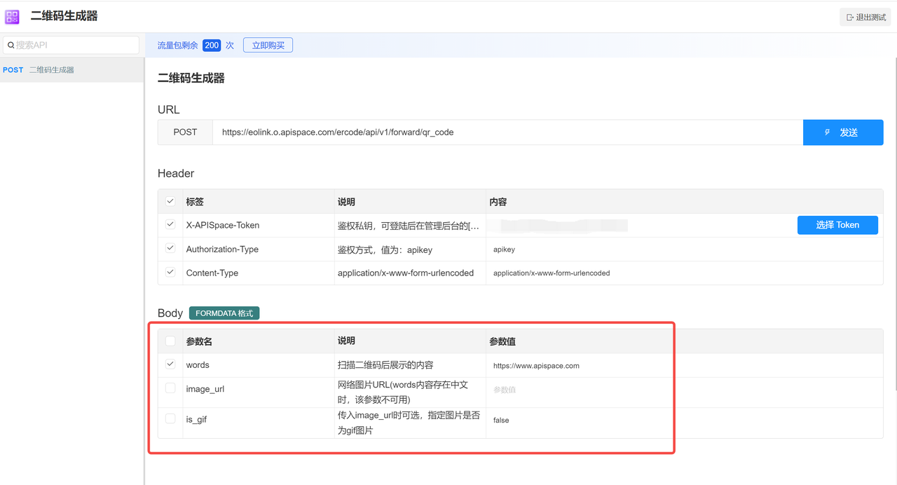 以 APISpace 为例,我们可以按照以下步骤生成二维码: