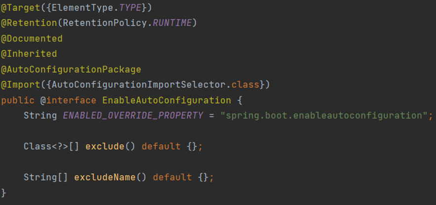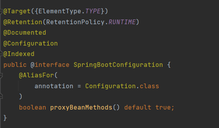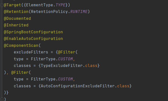 @SpringBootApplication:放在启动类上,包含(@Target、@Retention、@Documented、@Inherited、@SpringBootConfiguration、@EnableAutoConfiguration、@ComponentScan)