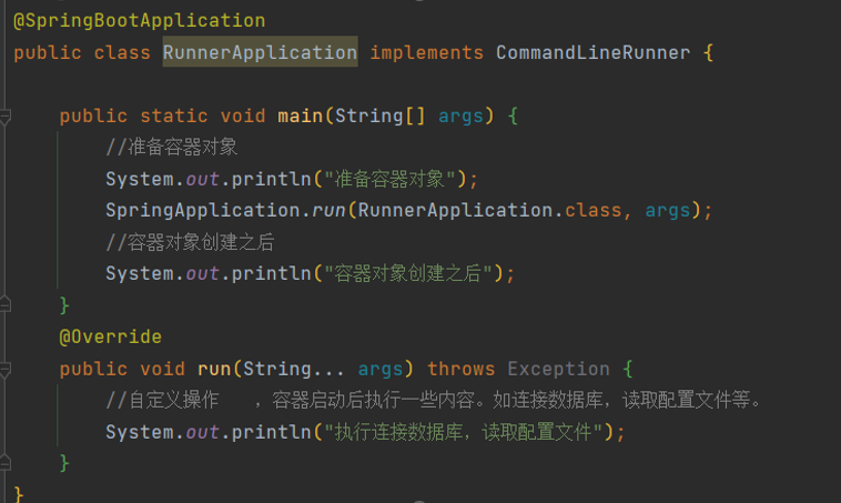 在开发过程中会有在容器启动后执行一些内容。如连接数据库,读取配置文件等。SpringBoot提供了两个接口:CommandLineRunner和ApplicationRunner,来实现,这两个接口中有一个run方法。两个接口的不同之处是:CommandLineRunne中的run方法参数为String数组,而ApplicationRunner中的run方法参数为ApplicationArguments。
