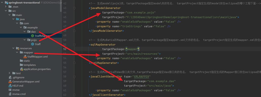 targetProject="F:\IDEADemo\SpringbootDemo\springboot-transactional\src\main\java">