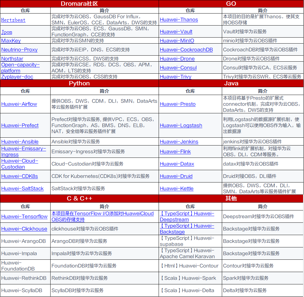 开发者将开源软件工具、开源应用和开源组件与华为云对象存储OBS、数仓DWS、云容器CCE等云服务对接,同时基于Terraform模板,上架到华为云云商店,支持其他开发者一键部署使用开源组件 ,我们称为“开源xxx for HuaweiCloud”。 下图为华为云开源项目仓库的示例,涵盖Dromara社区、Java、Go、Python、C&C++及其他开源类项目,数量超过100。感兴趣的开发者可以点击:华为云开源项目仓库 ,了解更多。