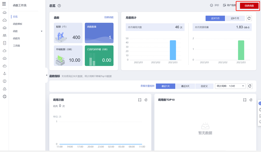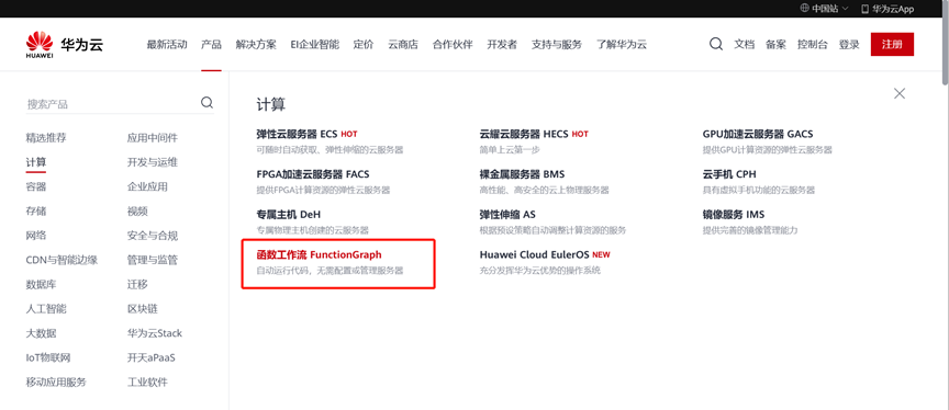 登录华为云后,按“产品”-“计算”-“函数工作流FunctionGraph”路径,进入华为云函数工作流FunctionGraph平台首页。