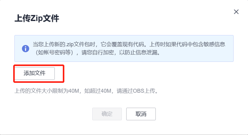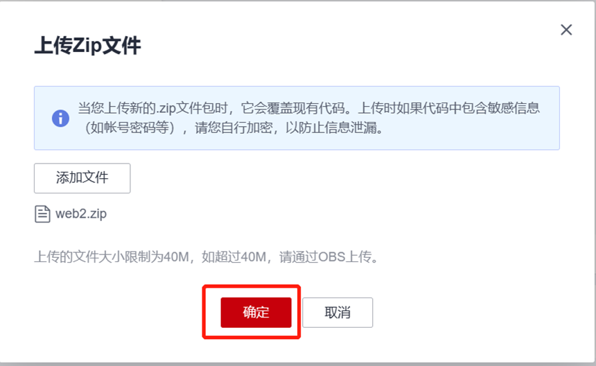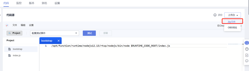 前往FunctionGraph函数页面,依次点击“代码”-“上传至”-“Zip文件”,上传从代码仓下载的“web2”文件包