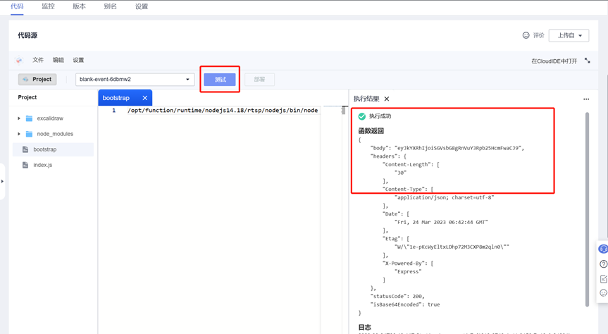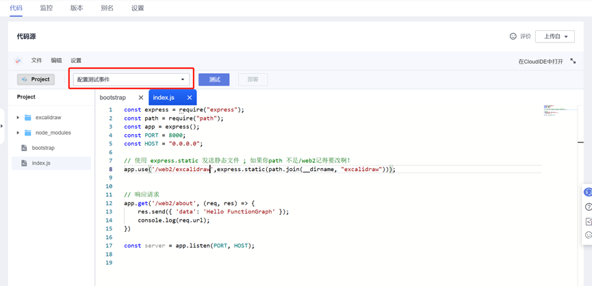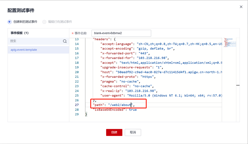 点击“代码”,点击“配置测试事件”,点击“创建”完成测试事件配置。