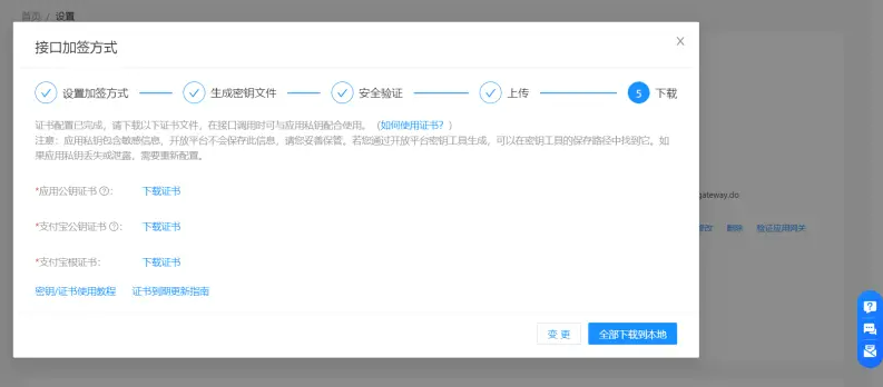 证书配置完成后,将生成的应用公钥证书、支付宝公钥证书、支付宝根证书全部下载至本地,便于在接口调用时与应用私钥配合使用。