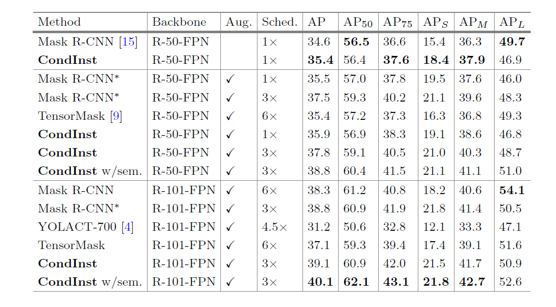 CondInst的inference比较直接,首先是检测部分得到检测的结果,然后采用box-based NMS来去除重复框,最后选出top 100的检测框,只有这部分instances会进行instance mask的预测。由于产生的mask head非常小,所以100个instance的mask预测时间只需要4.5ms,那么CondInst的预测时间仅比原始的FCOS增加了约10%。这里额外要说的一点是CondInst的box预测主要用于NMS,但不会参与instance mask的预测中,而Mask R-CNN是需要box来进行ROI croping。