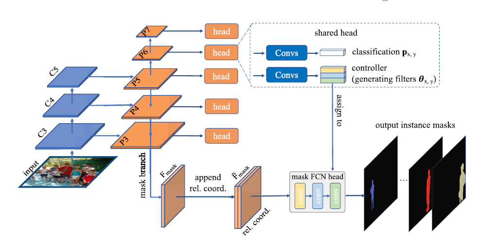 CondInst建立在FCOS之上,相比于FCOS有两点差异1).增加了一个Fmask分支,Fmask的特征来自于P3层,拼接了每个位置的相对坐标,作为mask head的输入来生成最终的实例mask。2).在FCOS的检测头上增加了controller head,controller head的输出用作mask head的权重。对于每一个实例, controller head的输出肯定不同, 相当于为每个实例定制了一个mask head,这也是为什么叫做动态mask head的原因,当mask head用于全局的Fmask feature上时,就可以区分这个instance和北京,获得实例级分割结果。这种动态生成卷积核的思想来自于CondConv,将一个网络的输出直接作为卷积核的权重。