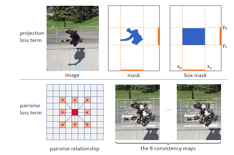 提出一种新的loss来替代传统实例分割中逐像素预测的方式。Boxinst将实例的mask预测分解为mask在x轴和y轴的投影预测,以及像素之间的一致性一致性预测。简单来说,就是约束box标注的投影与预测的mask在x轴和y轴的投影一致,相当于约束了mask的位置以及宽高。第二项约束一个区域内的类似像素趋于一致(论文中通过颜色相似性判断是否类似像素),这样通过box使得模型自监督的学习mask。