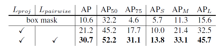 提出了一个即插即用的loss, 使得仅使用box的标注在COCO上就可达到mask标注的80%的实例分割性能(33.2 AP v.s 39.1 AP)。