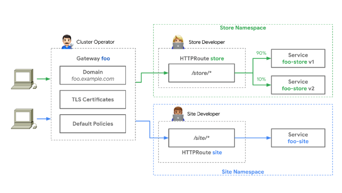 Gateway API通过面向角色的设计为K8s服务网络提供灵活的控制,该设计在分布式灵活性和集中控制之间取得了平衡。它允许许多不同的团队使用共享网络基础架构(硬件负载平衡器、云网络、网关等),所有这些团队都受集群维护者设置的策略限制和约束。如下是Gateway API官网的实例,集群维护者通过Gateway定义流量入口,以及TLS Terminate。集群中有两个租户,其中存储开发者在Store命名空间部署了自己的微服务,站点开发者在Site命名空间也部署了自己的微服务。他们在集群网关上共用同一域名,同一端口,因此网关只能通过匹配不同的HTTP Authority来路由客户端的请求。路由策略的设置则是由应用开发者们(Store、Site开发者)自己定义,然后绑定到同一个Gateway上。