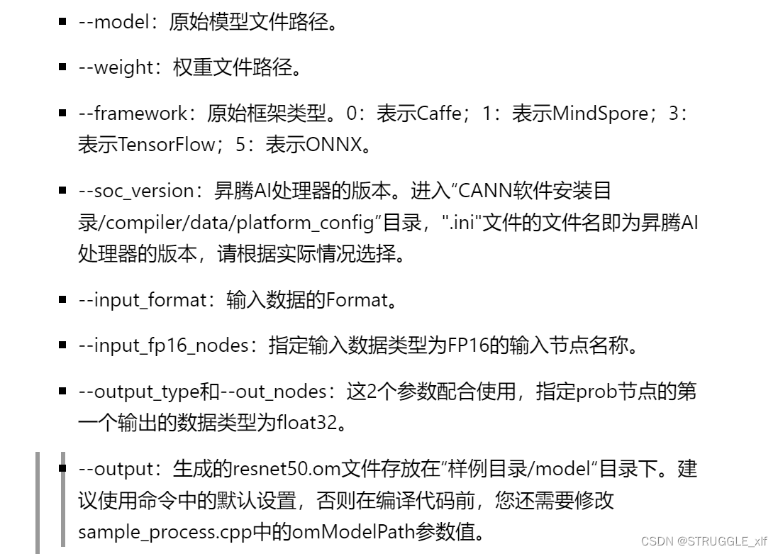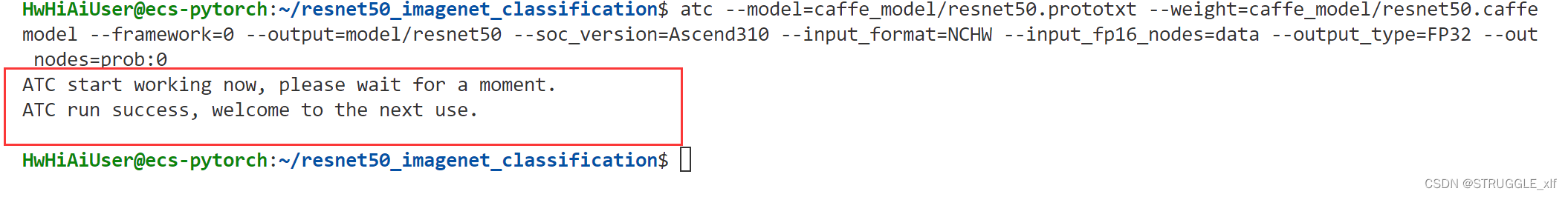 atc --model=caffe_model/resnet50.prototxt --weight=caffe_model/resnet50.caffemodel --framework=0 --output=model/resnet50 --soc_version=Ascend310 --input_format=NCHW --input_fp16_nodes=data --output_type=FP32 --out_nodes=prob:0