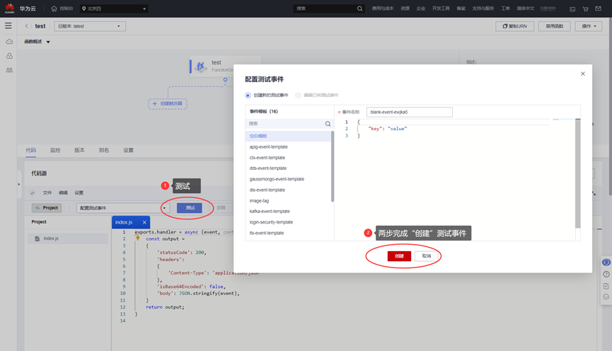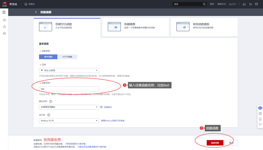 默认选择“创建空白函数”中“事件函数”,并任意填写函数名称,比如test,其余参数不用修改,点击右下角“创建函数”。