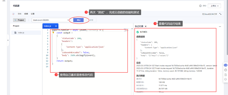 点击“测试”,“创建”一个测试事件,完成后再次“测试”,即运行代码并查看结果。
