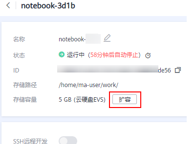 Notebook实例的存储配置采用的是云硬盘EVS,可在Notebook详情页申请扩容磁盘。