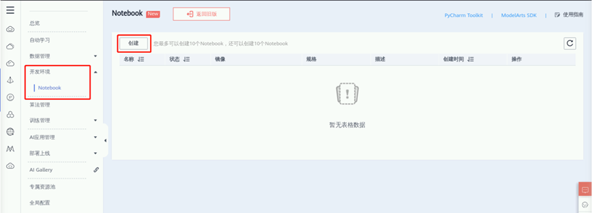 在服务列表中找到并进入人工智能服务 ModelArts,然后点击ModelArts 页面中左侧的【开发环境】选项一点击【notebook】 进入notebook 页面。点击【创建】按钮进入创建页面,并进行配置。