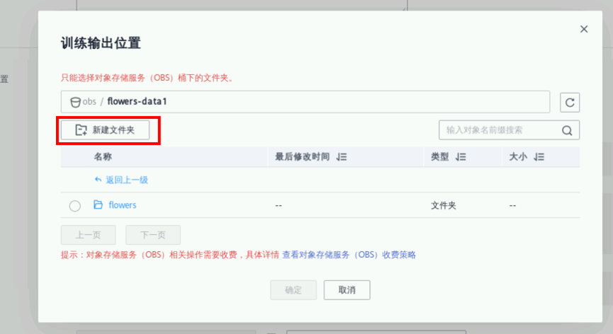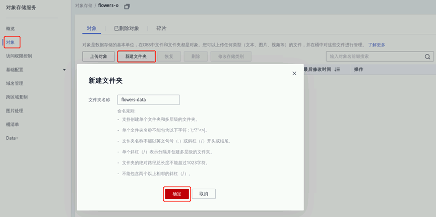 创建完成回到对象存储服务列表,点击刚刚创建的OBS桶名称进入详情页,选择左侧“对象”->“新建文件夹”(存放后续步骤的数据文件),然后选择确定。