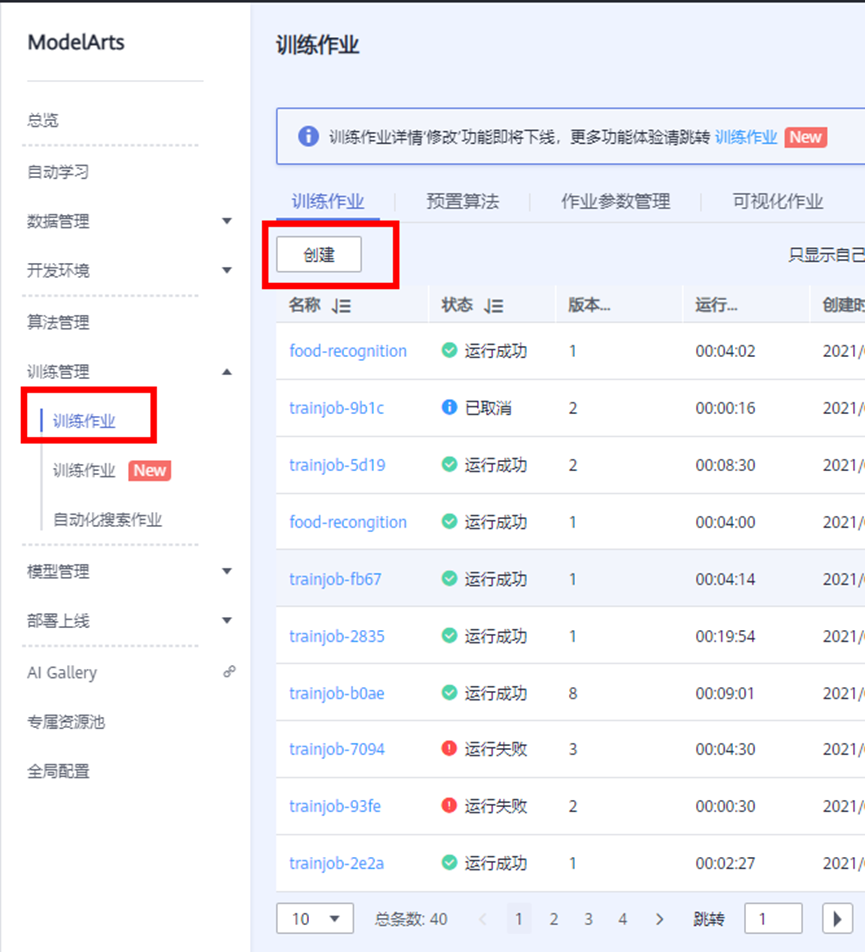 接下来回到在ModelArts主界面,在【训练管理】选择训练作业,点击【创建】: