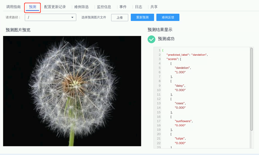 点击刚刚部署上线(已完成部署)的在线服务名称,进入服务详情,点击“预测”标签,在此可进行在线预测,如下图所示。