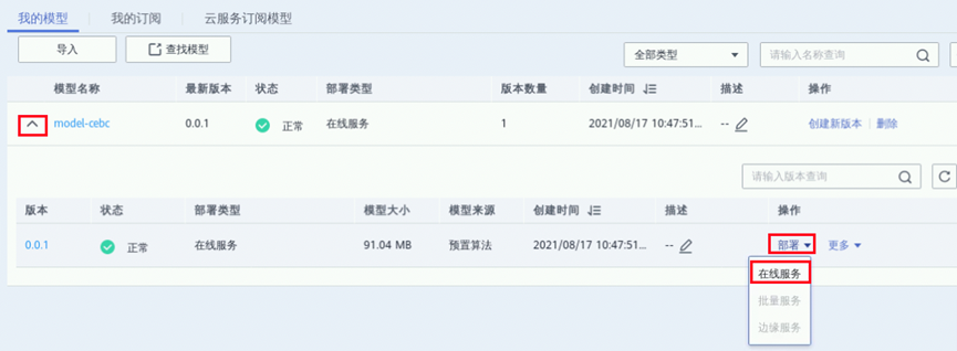 点击已创建模型名称前的下拉箭头,点击操作列中【部署】,选择部署菜单栏中的【在线服务】。或点击模型名称进入模型详情页,点击详情页右上角的【部署】,在部署菜单中选择【在线服务】。